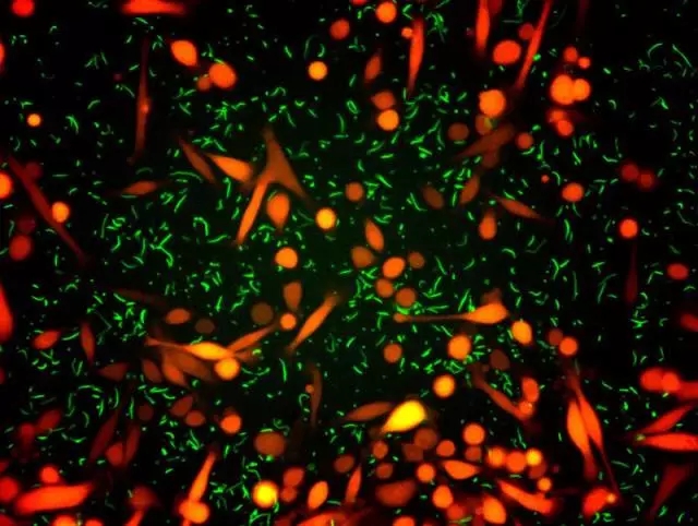细菌(绿色)在人类胰腺癌细胞(AsPC -1 细胞)内,细胞核染成蓝色,细胞质染成橘红色。 图片来自以色列魏茨曼科学研究学院